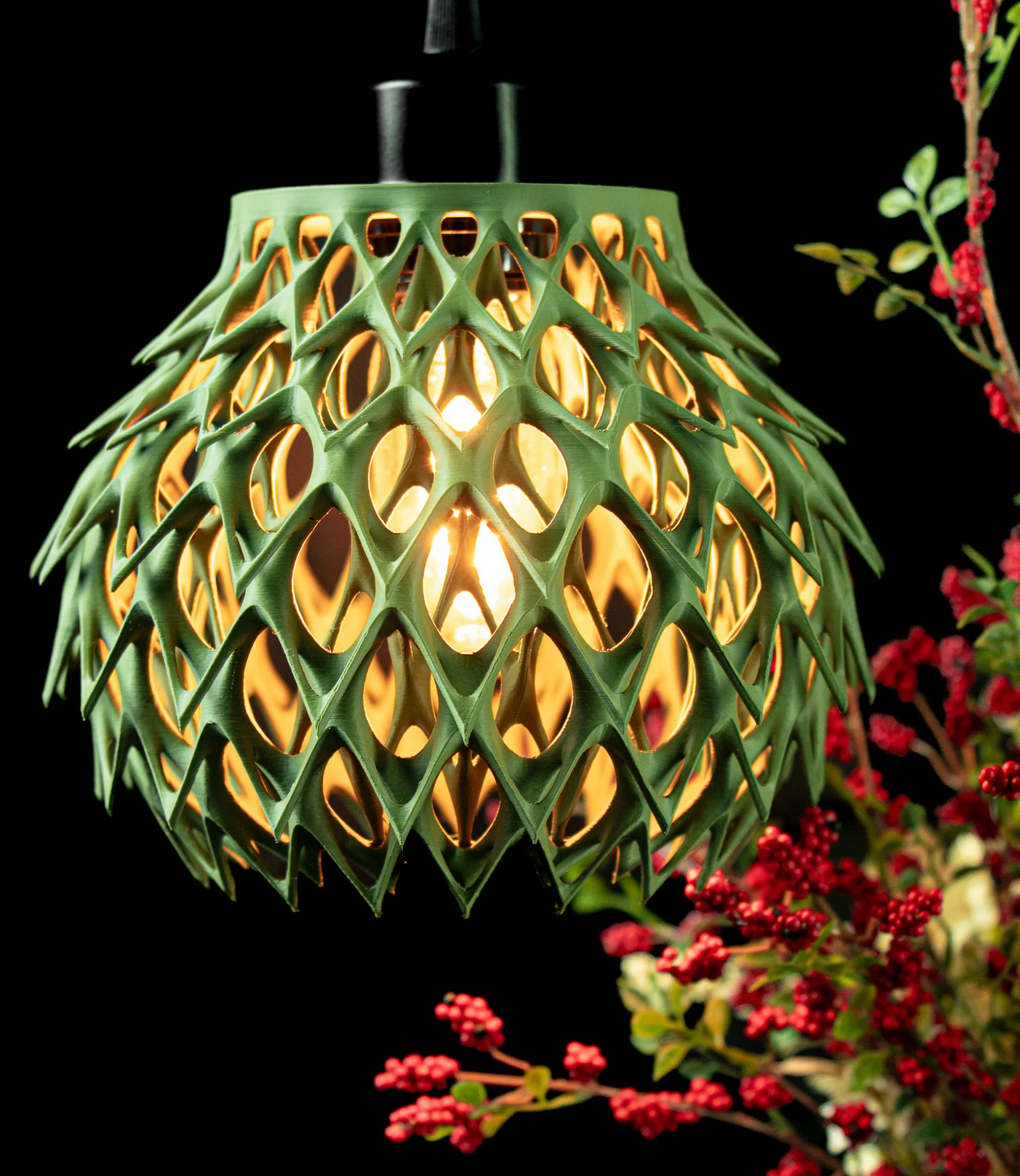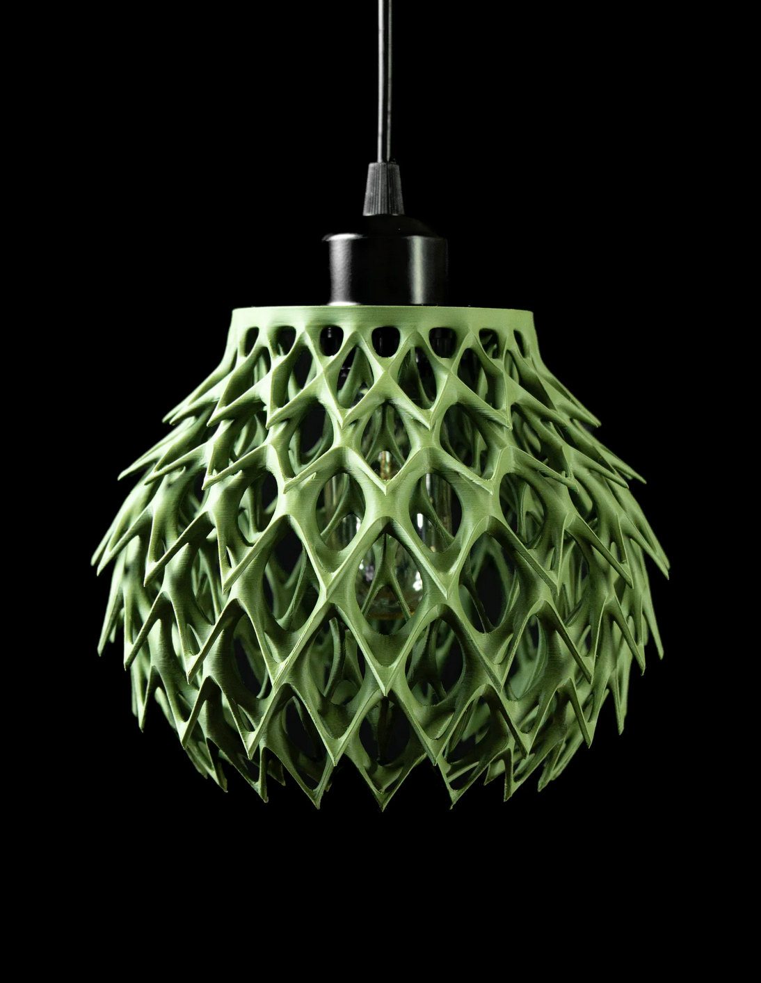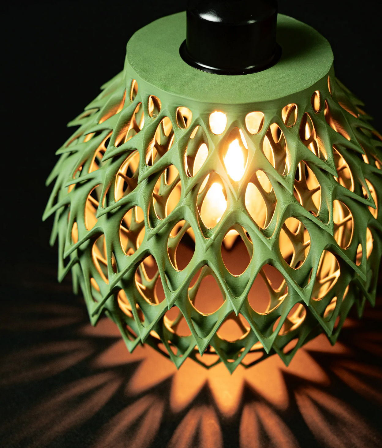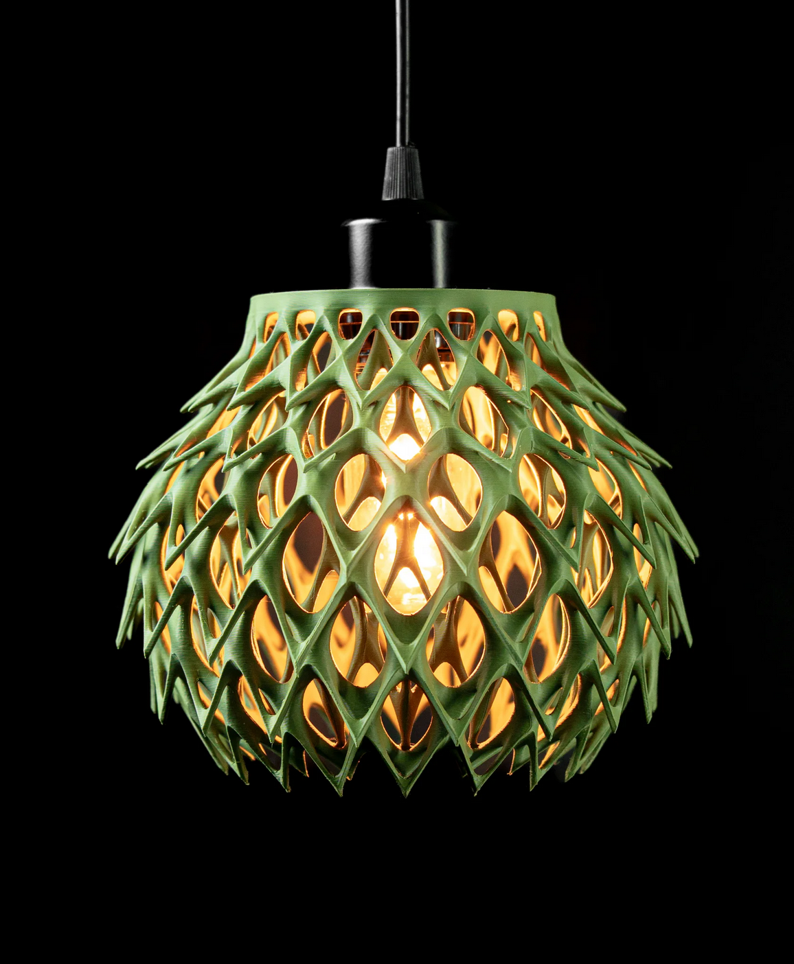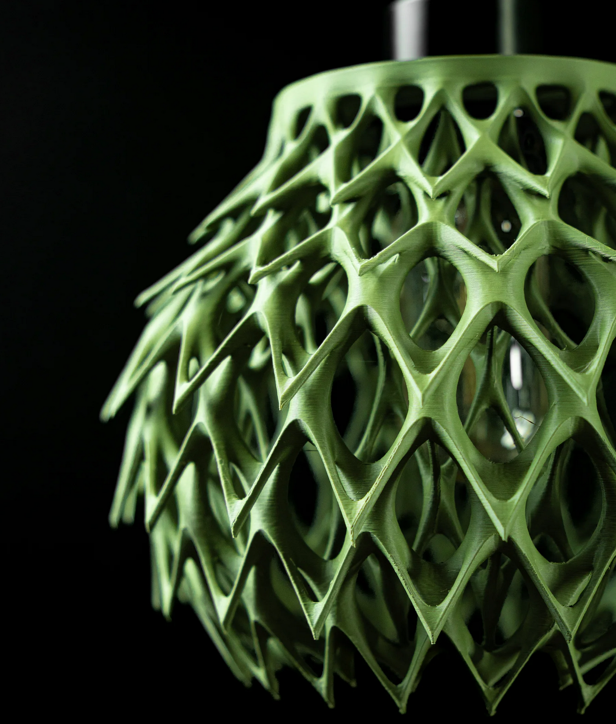 Diese Lampe ist kein Lichtspender – sie ist ein Kunstwerk! Mit ihrer spektakulären, netzartigen Struktur im Olivgrün zieht sie alle Blicke auf sich. Der Körper der Lampe wurde im hochpräzisen 3D-Druckverfahren gefertigt und wirkt wie eine organische Skulptur – fast wie gewachsen.
